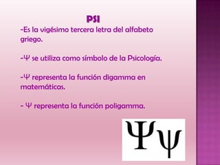 Alfabeto GRIEGO 】 Significado de las letras griegas La palabra "alfabeto" proviene del griego ἀλφάβετον (alfábeton). Deriva de las dos primera letras del alfabeto griego ἄλφα (alfa, α) y βῆτα (beta, β) El alfabeto griego tiene una gran importancia en nuestra lengua actual, pues se ha convertido en base de otros alfabetos de gran importancia como por ejemplo el alfabeto latino. Γ - Wikipedia, la enciclopedia libre Gamma (Γ γ) es la tercera letra del alfabeto griego.Deriva de la letra gaml del fenicio.En griego moderno, se pronuncia como fricativa velar sonora [ɣ] o como fricativa palatal sonora [ʝ]. En griego antiguo, se pronunciaba como oclusiva velar sonora [ɡ].Tanto en griego antiguo como en griego moderno, gamma se pronuncia [ŋ] delante de velares (incluyendo la propia gamma, así, una doble ... Alfabeto Griego - Muhtiyaniapartini En el alfabeto griego gamma es la tercera letra γ en minúscula o Γ en mayúscula. Alfabeto griego. En este video encontraras todo acerca de este alfabeto y el que lo llevo a ser uno de los más reconocidos en la actualidad. Ψ - Wikipedia, la enciclopedia libre Ψ Psi (Ψ ψ) es la vigésima tercera letra del alfabeto griego. Fue trasliterada con el dígrafo ps por los romanos en palabras tales como psalmus, psalterium y psyche ( salmo, salterio y psique ). No debe confundirse con Ѱ, letra cirílica. Índice Historia Variantes epigráficas